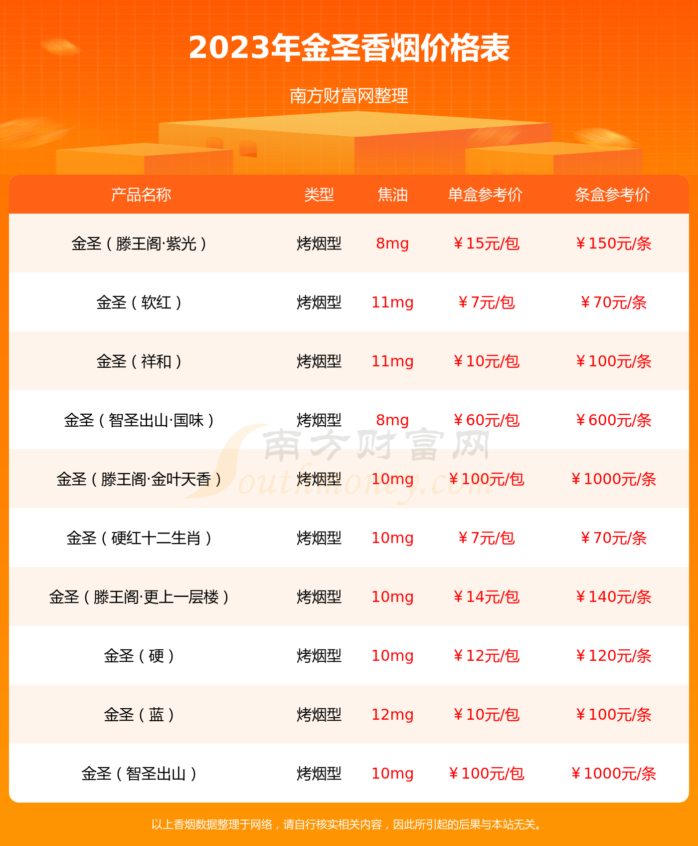 1、金圣(硬滕王阁):以经典的中国红为主色调,辅以精致的金色图案,设计大气而典雅,烟草香气浓郁,口感柔和,适合喜欢传统烟草香味的消费者。