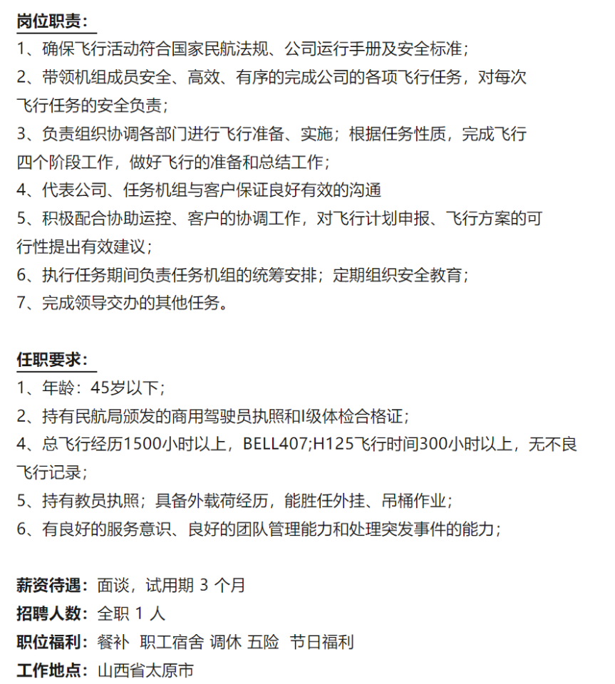 2、拥有丰富的飞行经验,熟练掌握航空导航、气象及飞行原理。